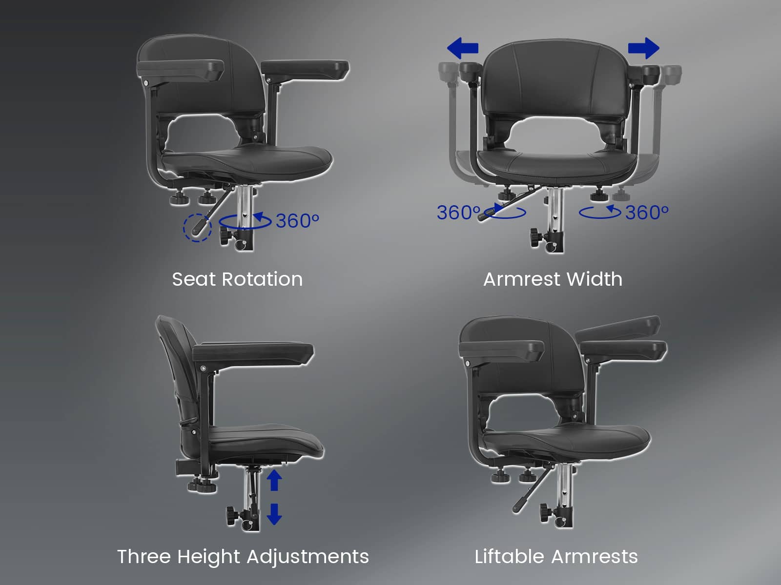 - 360° Rotating Seat, Armrest & Height & Width Adjustable